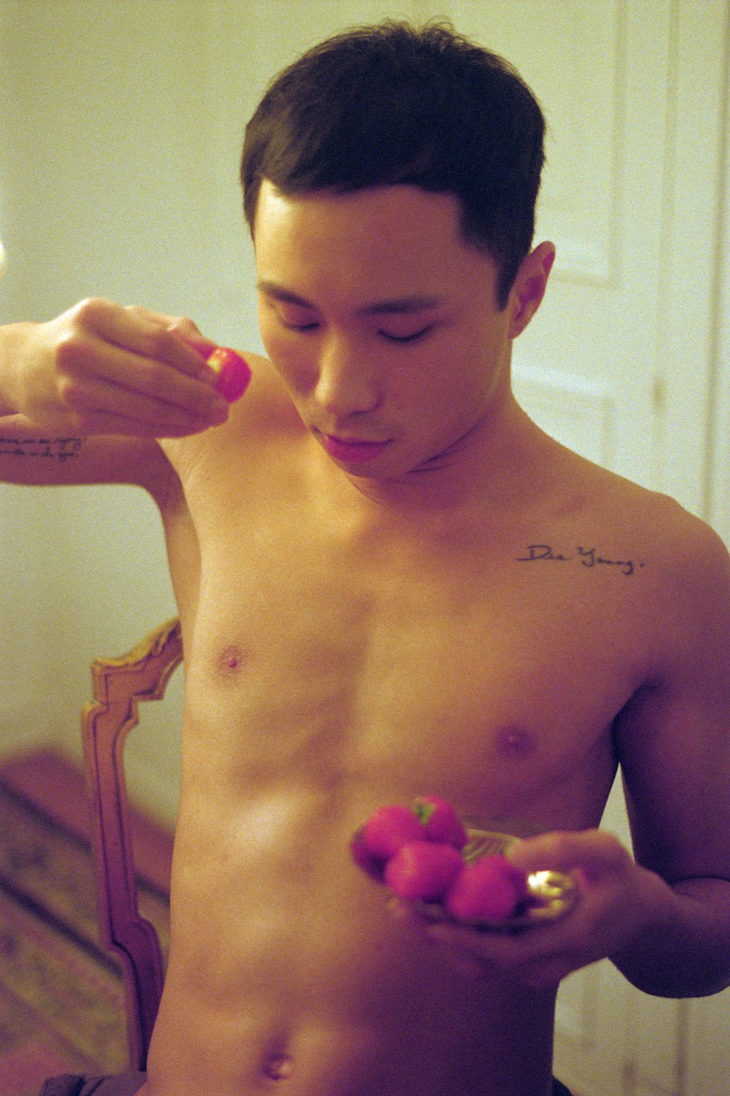 In this shoot I wanted to explore the sensuousness of fruit. At times they were simple accessories in poetic still lifes captures on film; at other times the fruit conveyed a lustful desire and latent sexual energy. As you can see here Christian really brought the eroticism of strawberries to life.