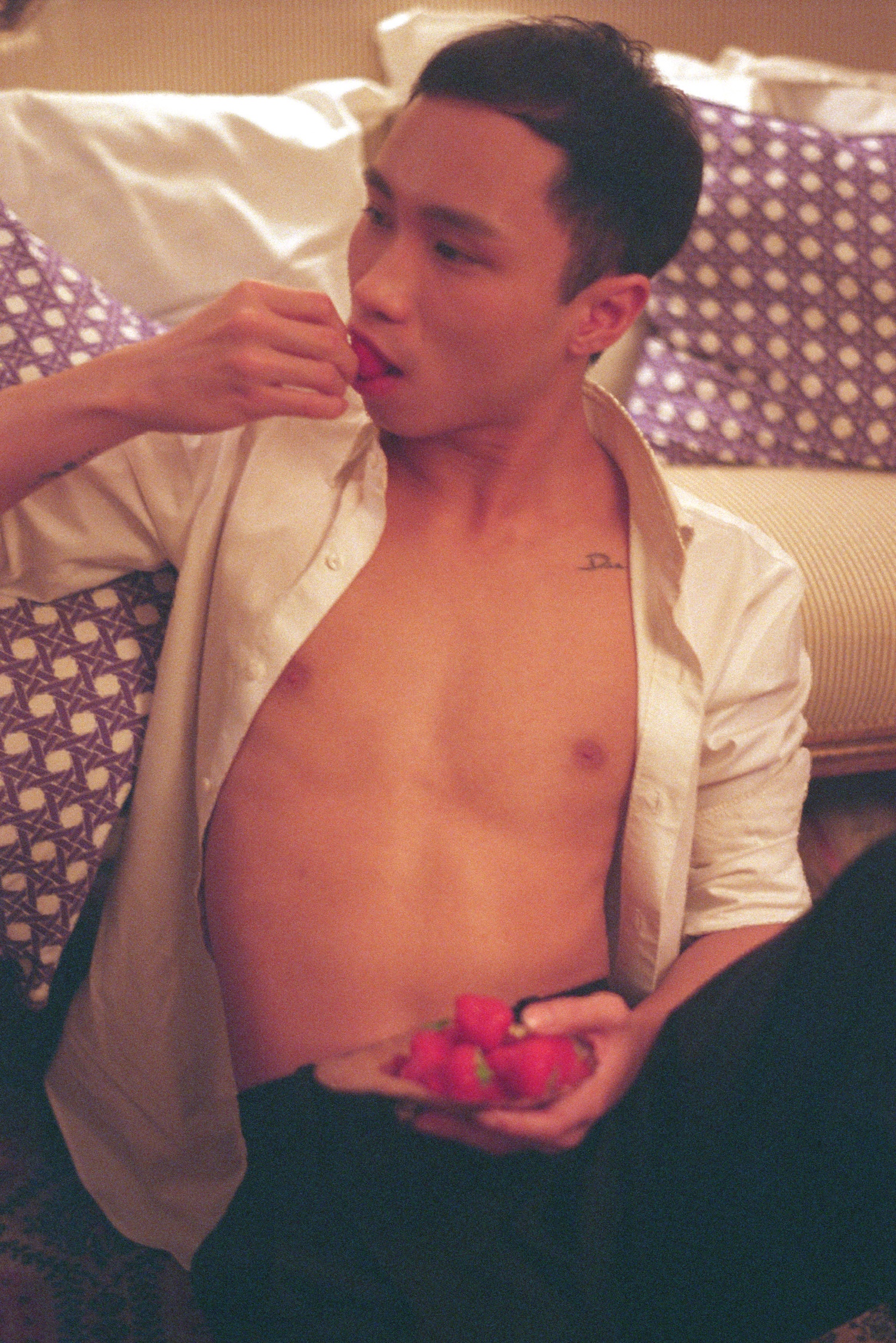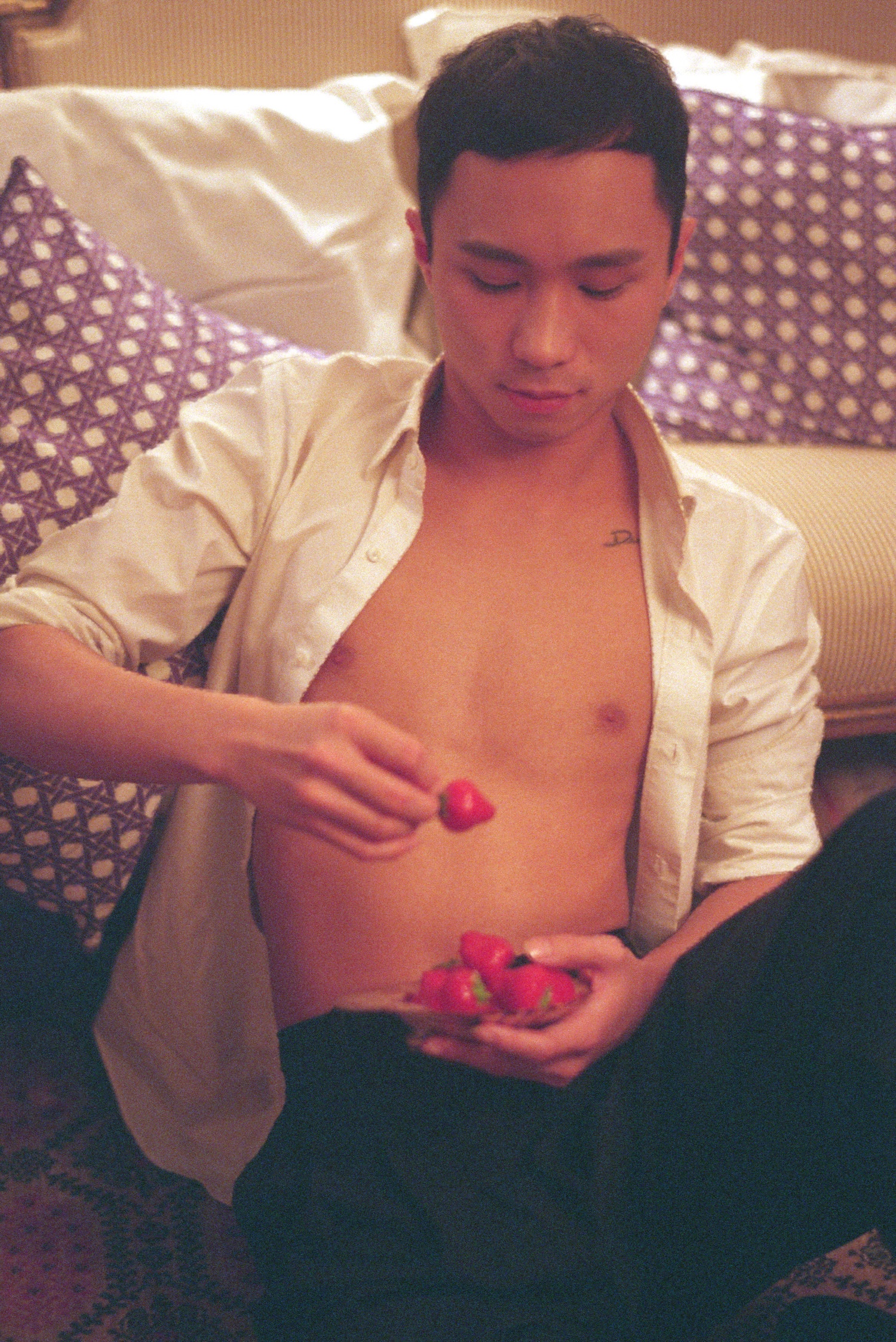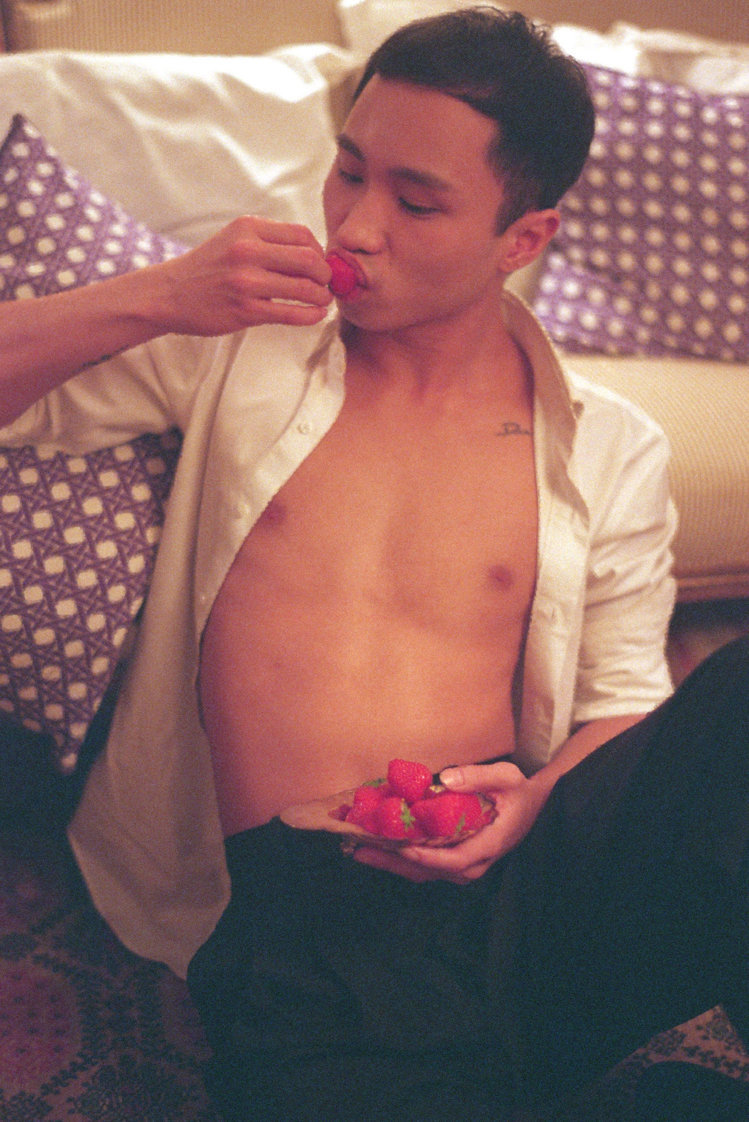 Below Christian begins to taste the strawberries, his shirt undone, before getting undressed.