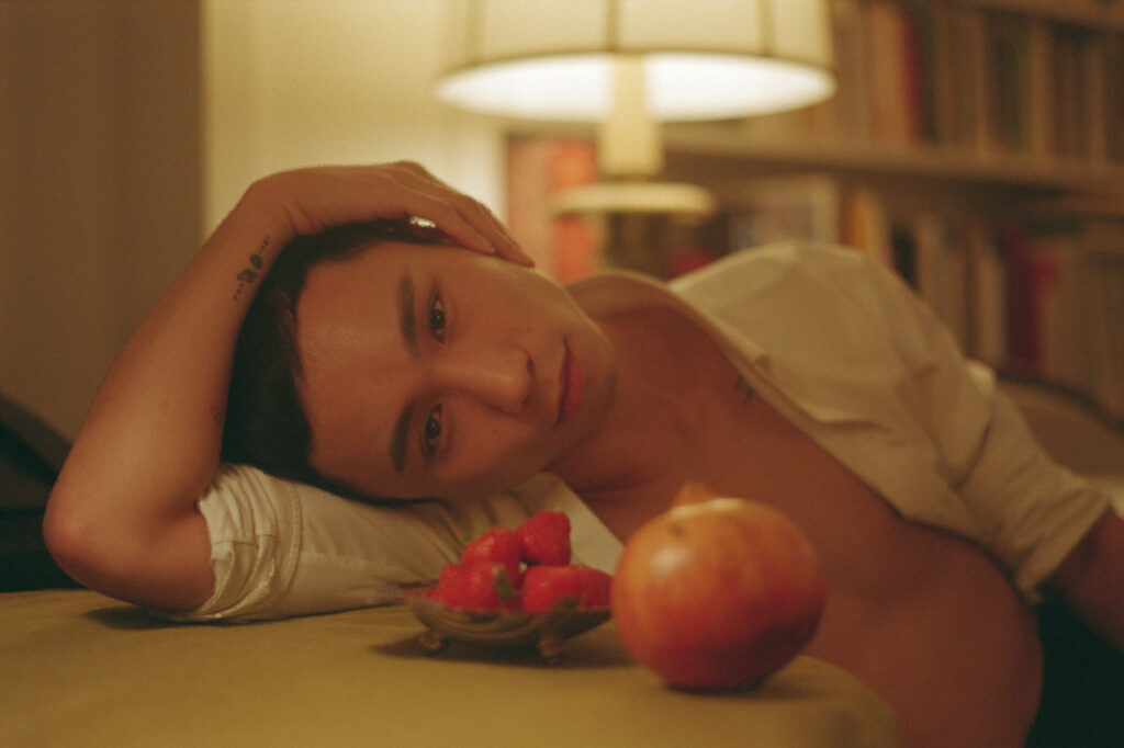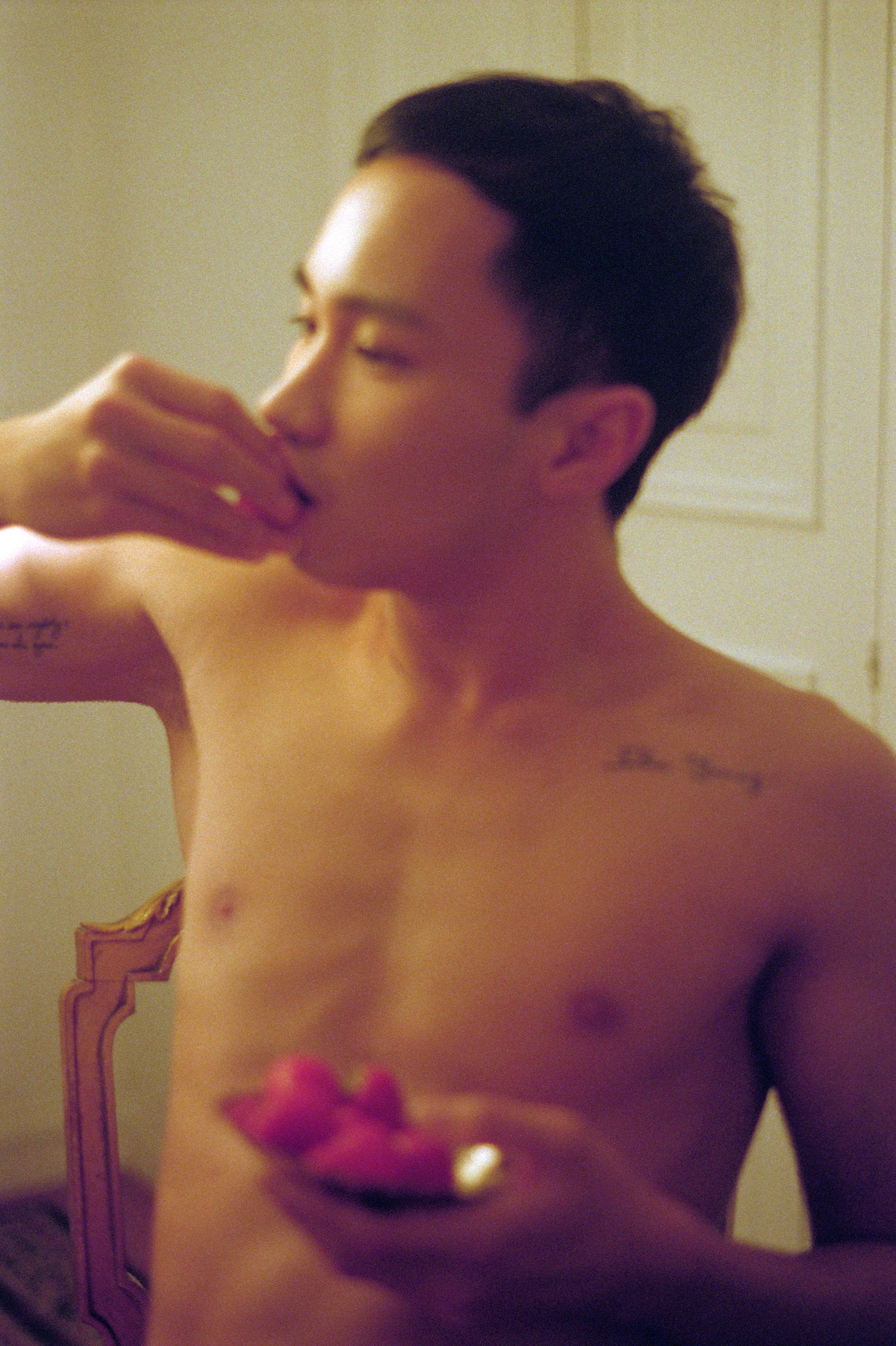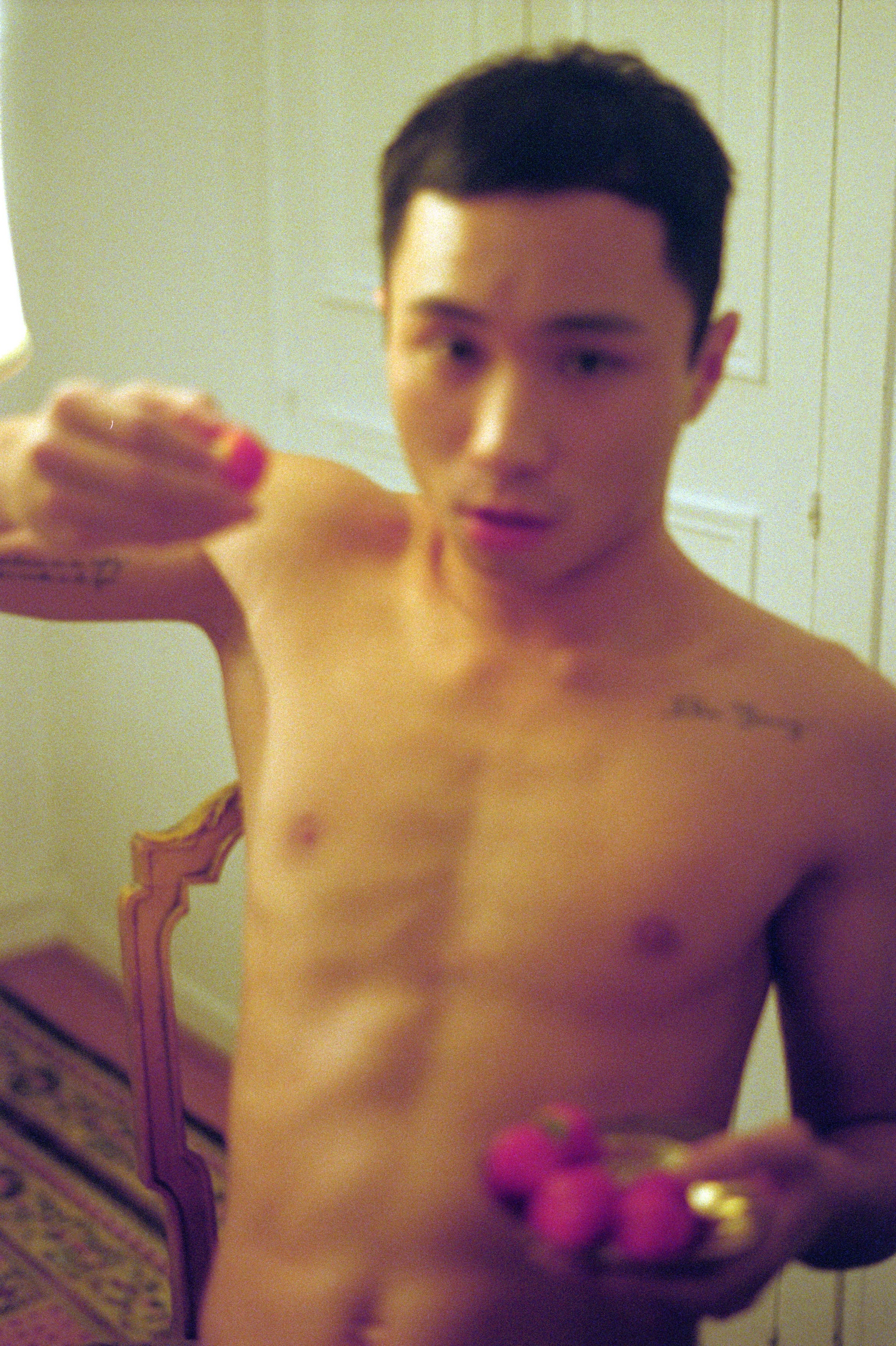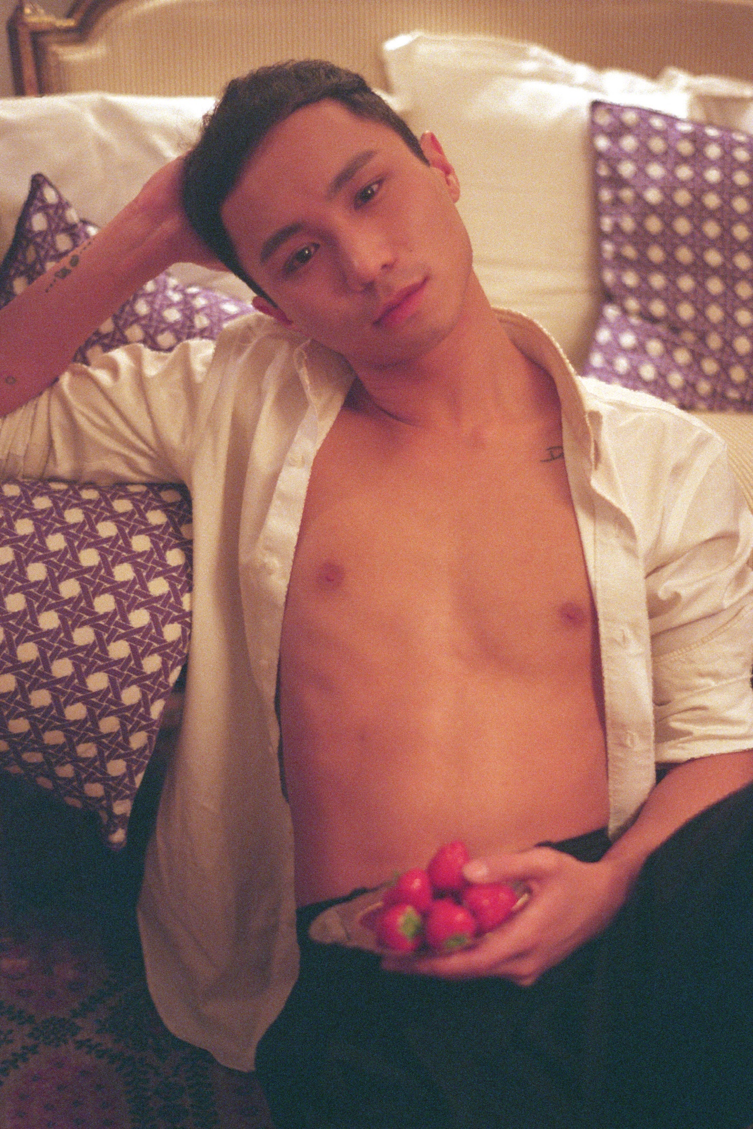 Below Christian begins to taste the strawberries, his shirt undone, before getting undressed.