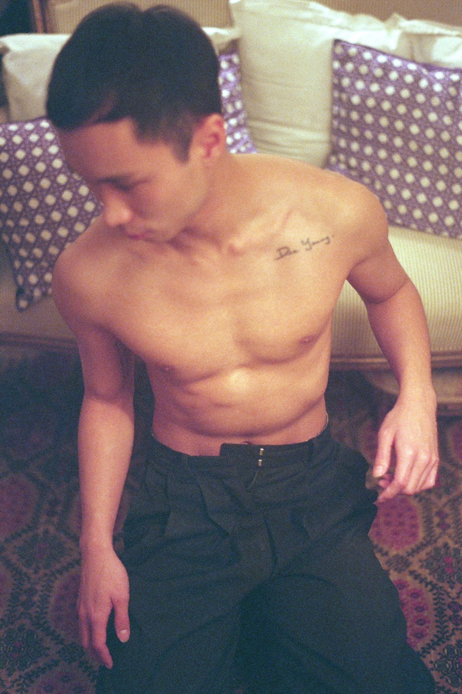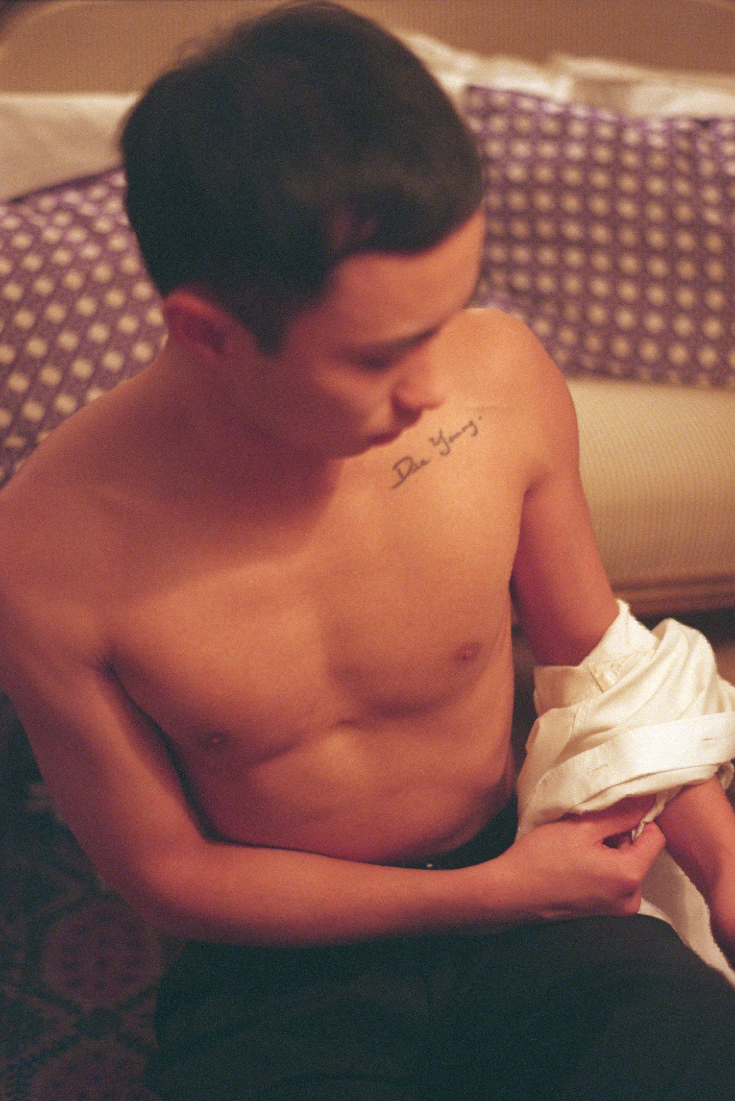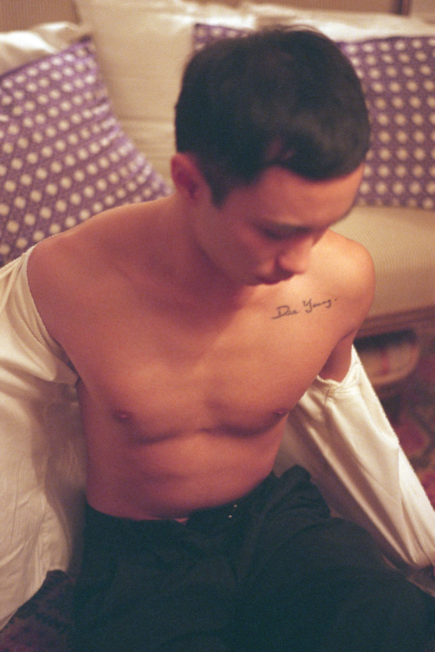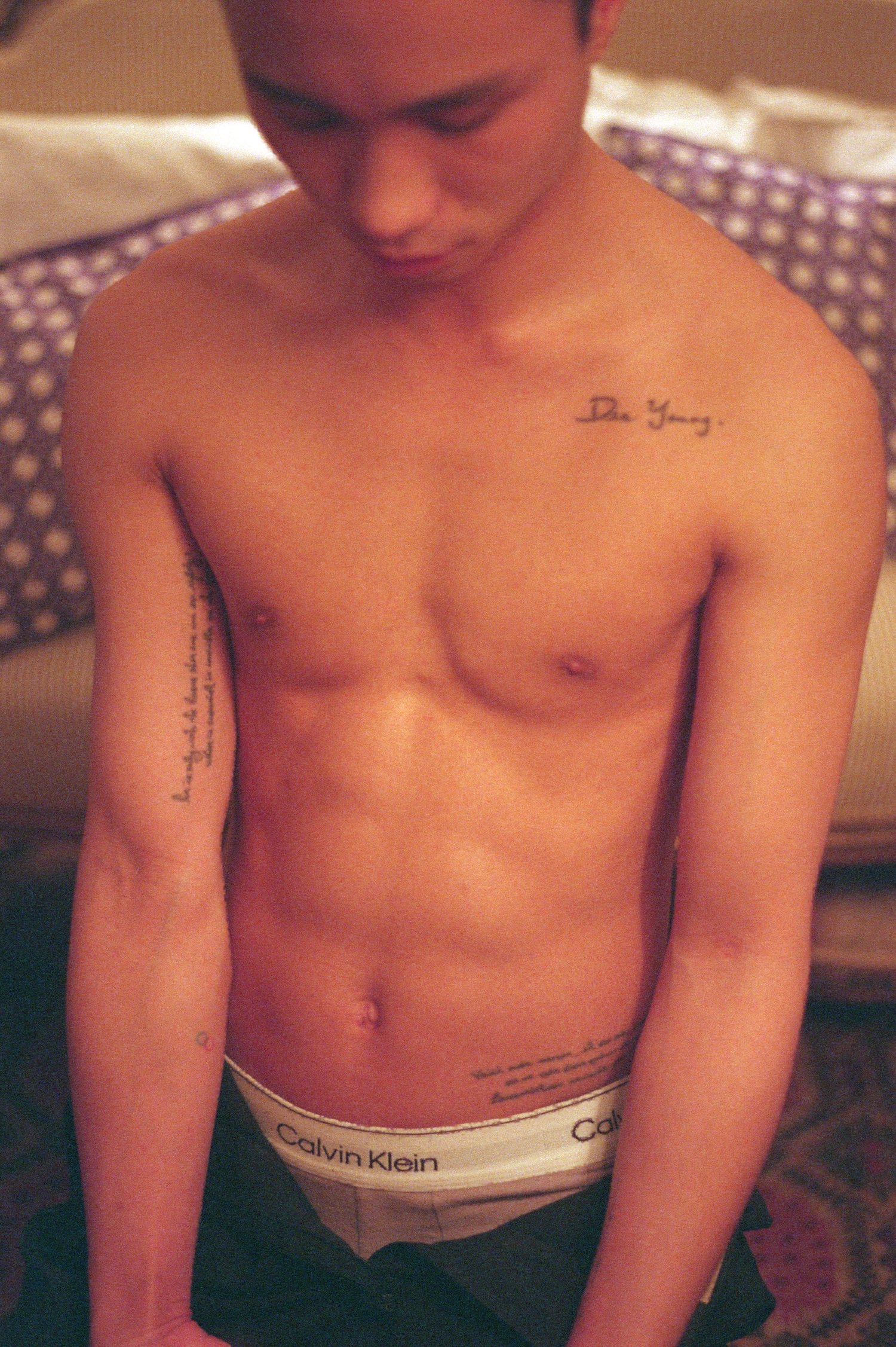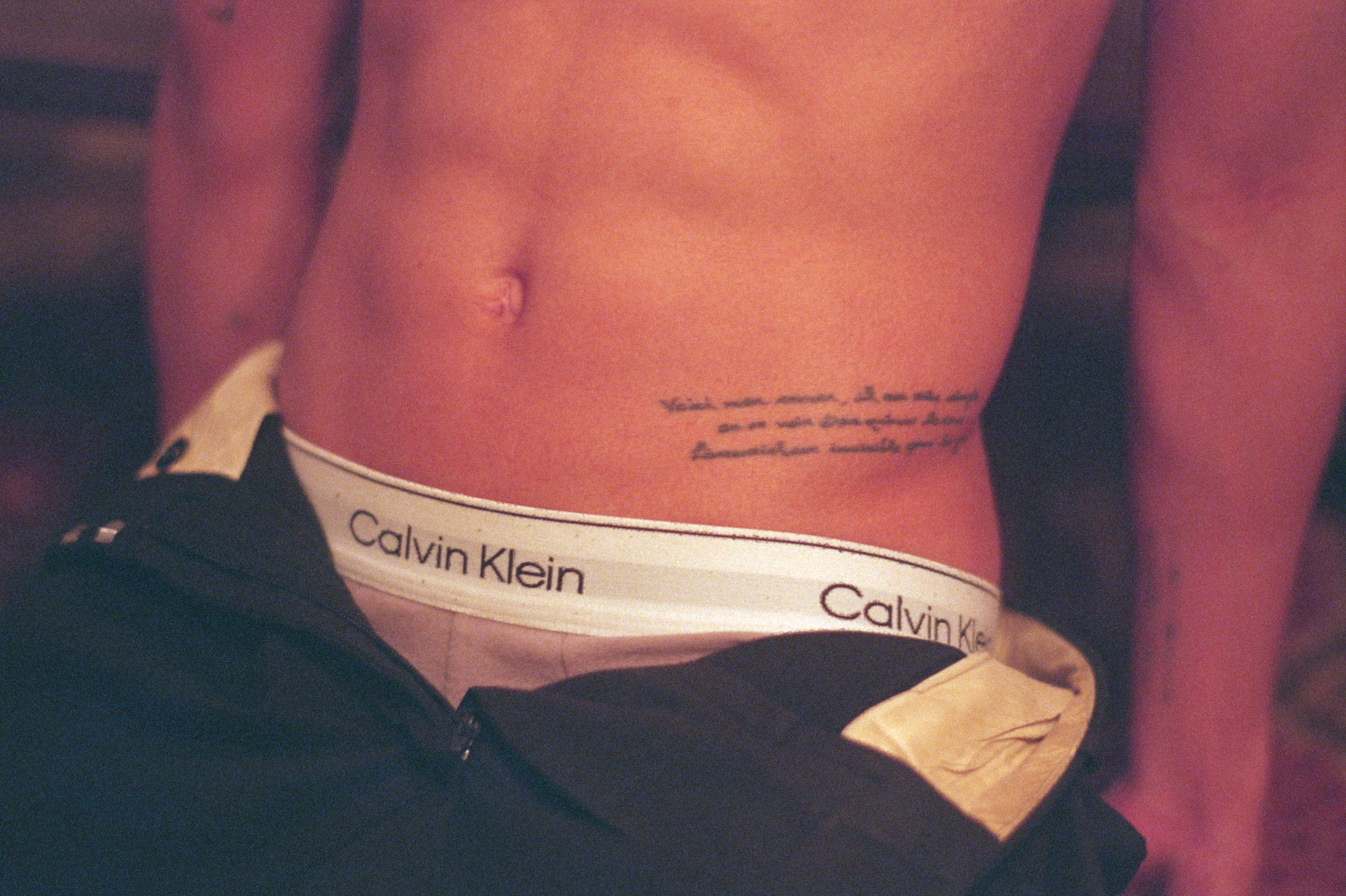 As Christian gets undressed you can begin to see some of his tattoos, ‘Die Young’ and a quote from The Little Prince.